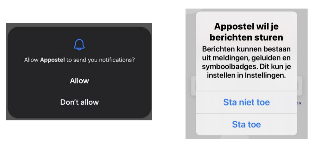 Wanneer de appostel app voor het eerst gestart wordt vraagt hij u notificaties mag sturen. U kunt kiezen om dit wel of niet toe te staan. Dit kan later in de instellingen altijd weer gewijzigd worden.