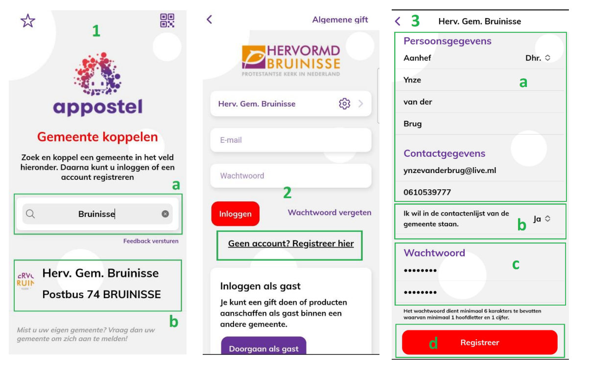- (b) Hier kunt u aangeven of u wel of niet in de contactenlijst van de gemeente wilt staan. Dat betekent dat andere gemeenteleden u contactgegevens kunnen zien via de Appostel app.