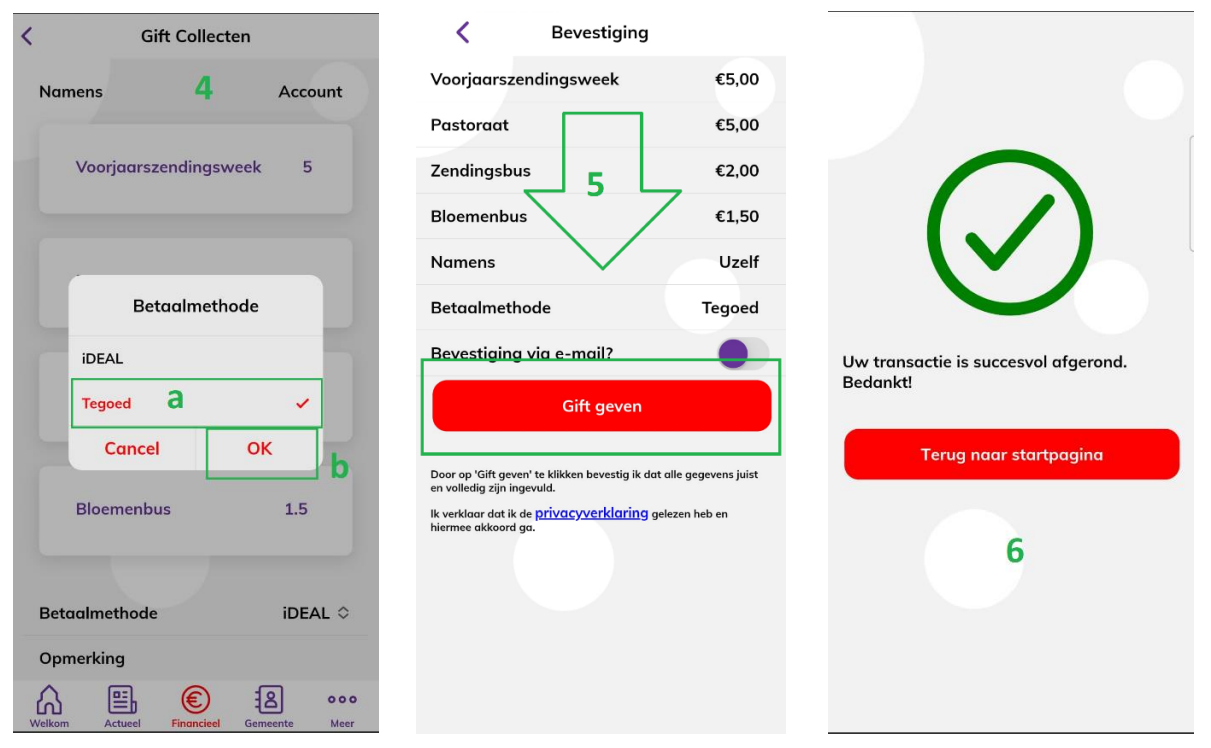 - (5) Wanneer u naar beneden scrolt wordt de knop “Gift geven” zichtbaar. Hier kunt u op klikken. Wanneer u eerder voor iDeal had gekozen wordt u doorgestuurd naar de app van uw bank om de betaling te voltooien zoals u gewend bent. Als u “Tegoed” had gekozen wordt de transactie direct afgerond en wordt het gekozen bedrag van uw tegoed afgehaald.